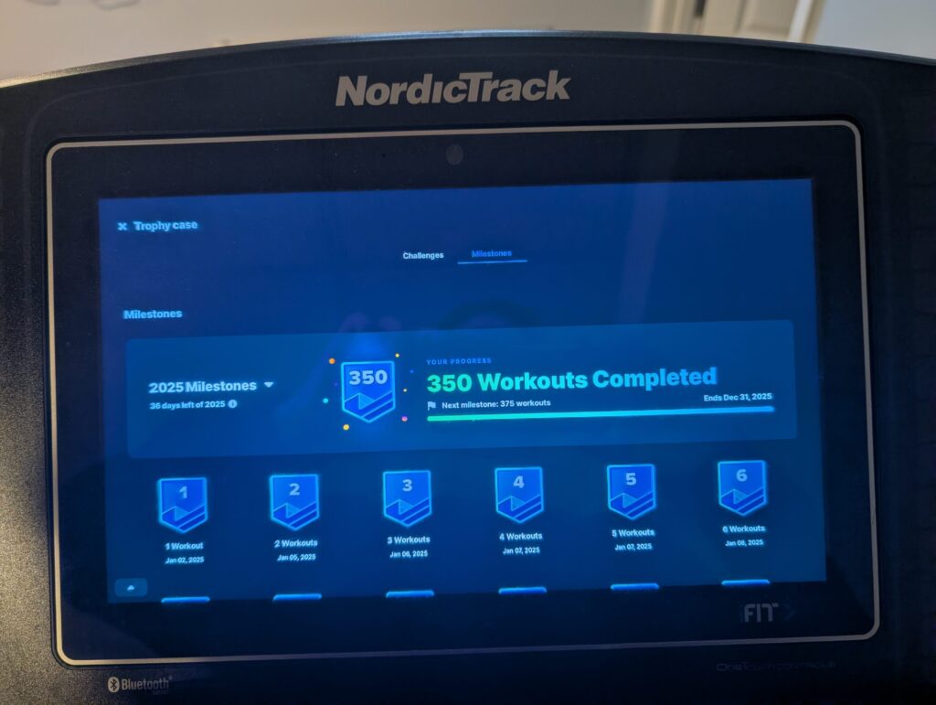 As of this morning (November 25, 2025), I have completed 350 iFit workouts. My goal was 325 in IFit and 350 in total. I hedged iFit workouts a bit lower since they are harder to do while traveling. I found I can use the app on my phone to use the treadmill or elliptical at the hotel.